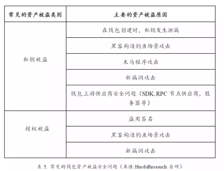 钱包通常具有较高的安全性,它无需信任任何第三方机构,所以钱包用户拥有对其钱包资产的完全的控制权。与中心化钱包相比,用户不必担心银行或交易平台挪用资产或者滥用资产管理权限。钱包对中心化机构的依赖较小,受到单点故障与攻击的概率较小,但是当前大部分的钱包使用者是自己负责管理私钥和资产,因此它更容易受到社会工程攻击和病毒感染等等威胁(表 5)。