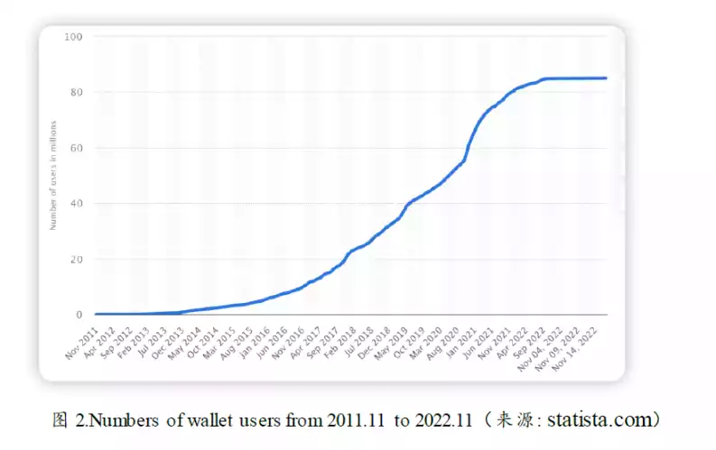 从用户数量上来看,目前全球有超过 3 亿人在使用加密资产,从来自 statista.com 的数据显示,截至 2022 年 11 月,全球钱包用户数量为 85M,较 2021 年年底(12 月份)80M 增加约 6.3%,相对于上一年增幅 35% 有所下降,但随着熊市结束下一个周期的到来,目前正处于爆发增长的前夜。