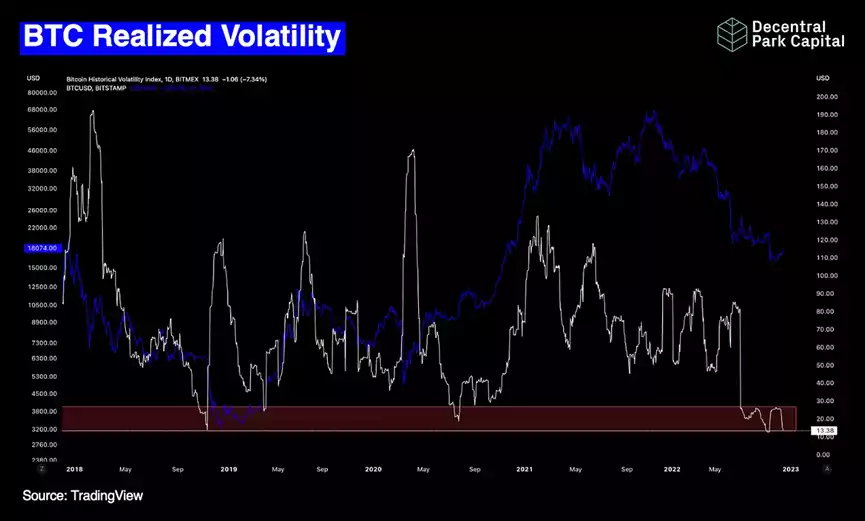 内容:Bitmex 的 7 D BTC 实现波动率指数在 2022 年下半年保持低位。