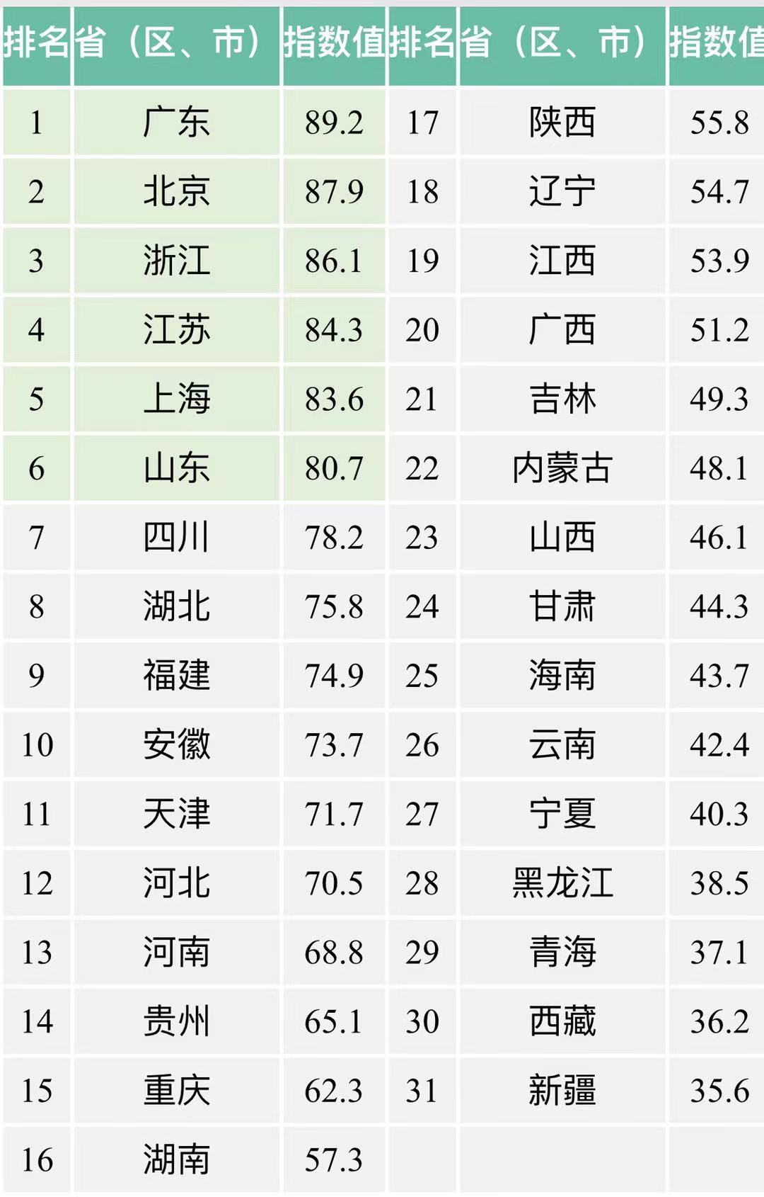 指数排名: 六个省份领跑全国,西部地区正加速突破