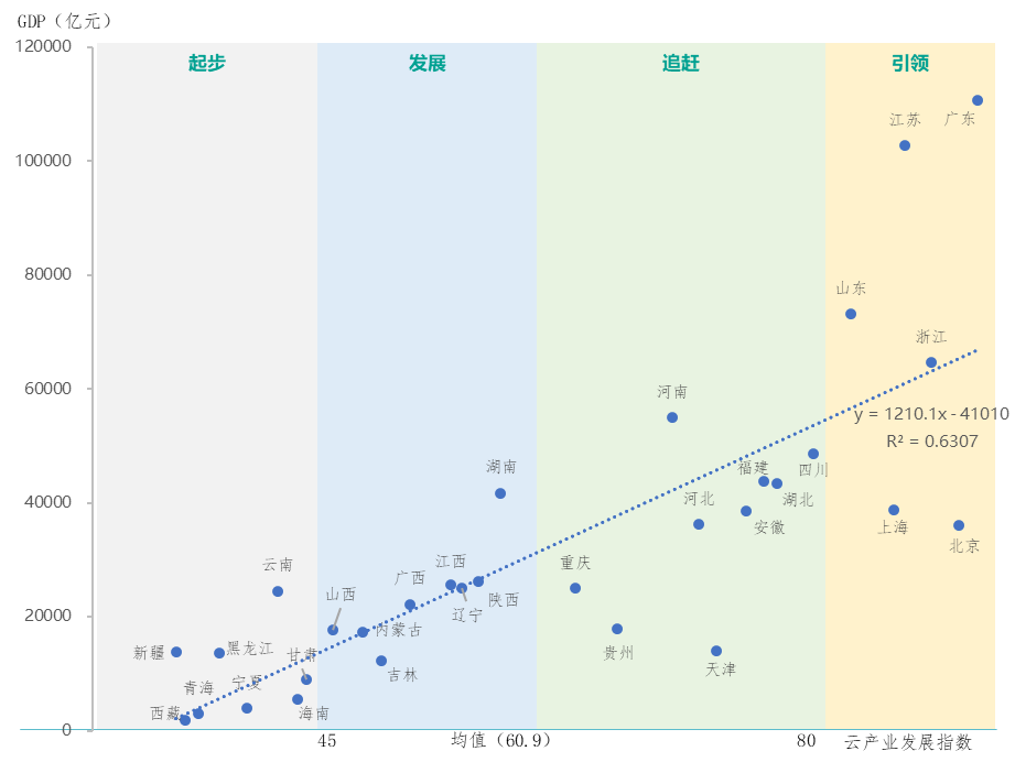 基于线性拟合结果,总的来看各个省(区、市)GDP与云产业发展指数呈现显著正相关关系,R2大于0.6。云产业作为数字产业的典型代表,涉及云应用、云设施等,有力推动各行业进行数字化转型,并有效拉动GDP增长。据综合测算,云产业指数每增长1个点,GDP约增加千亿元产值。另外,同自身经济规模相比,一些省份(如贵州)的云产业发展水平呈现超前发展态势。