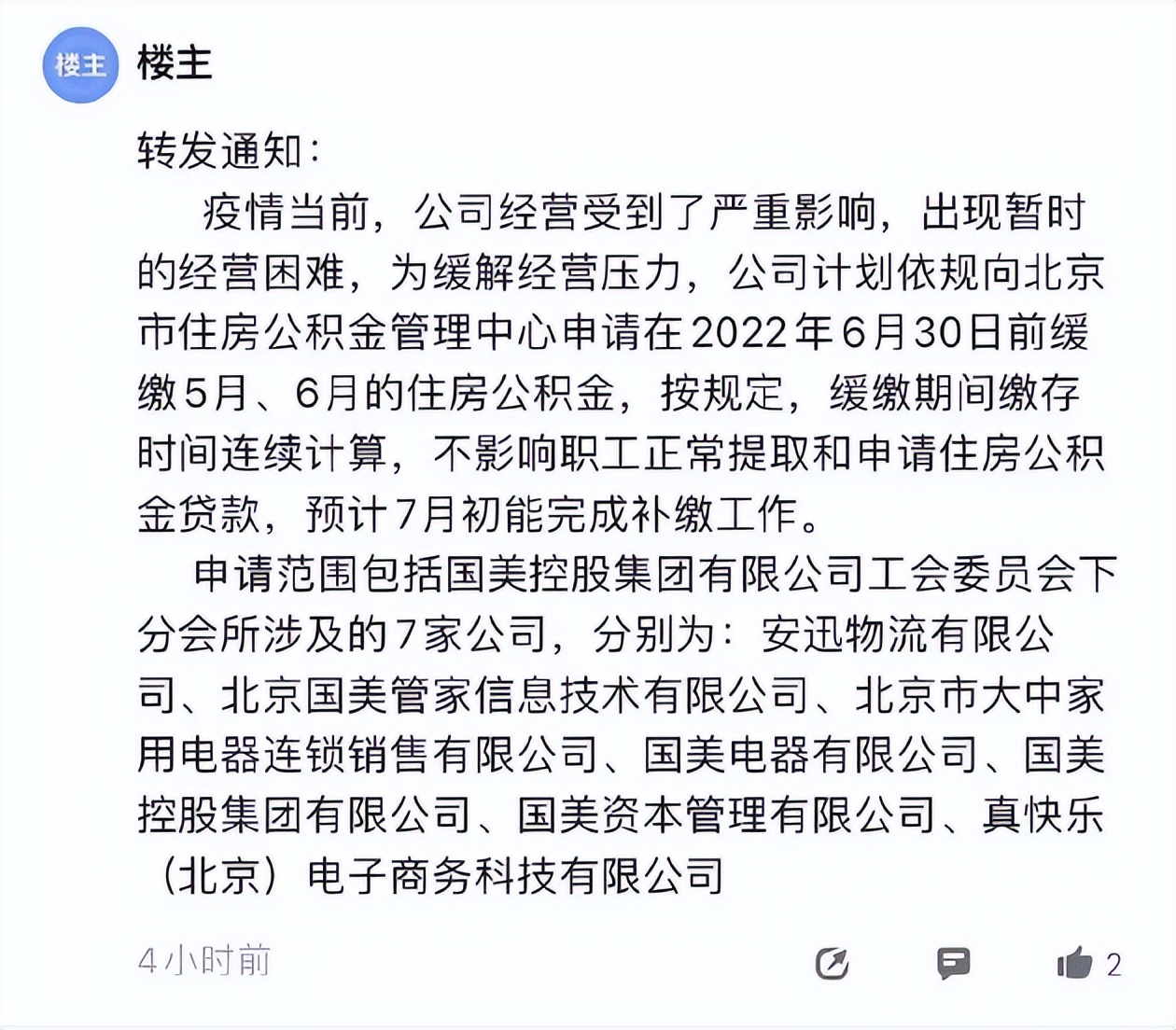 据网传的“通知”显示,疫情当前,公司经营受到了严重影响,出现暂时的经营困难,为缓解经营压力,公司计划依规向北京市住房公积金管理中心申请在2022年6月30日前缓缴5月份、6月份的住房公积金,按规定,缓缴期间缴存时间连续计算,不影响职工正常提取和申请住房公积金贷款,预计7月初能完成补缴工作。申请范围包括国美控股集团有限公司工会委员会下分会所涉及的7家公司,分别为:安迅物流有限公司、北京国美管家信息技术有限公司、北京市大中家用电器连锁销售有限公司、国美电器有限公司、国美控股集团有限公司、国美资本管理有限公司、真快乐(北京)电子商务科技有限公司。