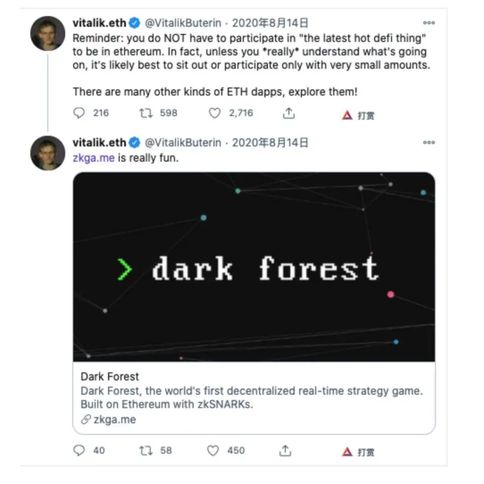 因为一旦发现了其他的文明,就会毫不犹豫地消灭对方,这整个宇宙就像是一个黑暗森林。这款名为“黑暗森林”的以太坊游戏的玩法便是由此而来的。