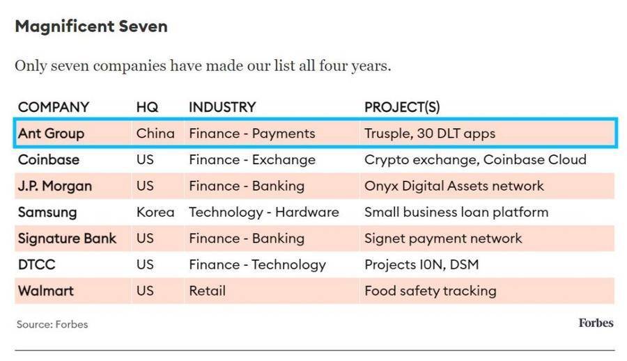 今年是《福布斯》连续第 4 年评选 " 全球区块链 50 强 "。从评选结果来看,有 7 家公司连续 4 年上榜,其中蚂蚁集团凭借蚂蚁链成为中国唯一一家连续 4 年上榜的公司。而嘉吉、IBM、ING、微软、VMware 连续在榜 3 年后首次掉出榜单。