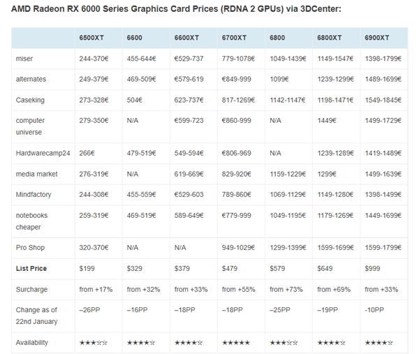 根据奥地利和德国显卡市场平均溢价幅度分别为157%和145%,这也说明了比官方零售价便宜了一半多左右。要知道在去年年底,平均溢价为185%-190%,再往前看,在去年5月显卡巅峰时期,平均溢价为318%和216%,跌幅为51%和33%确实便宜了一半多。