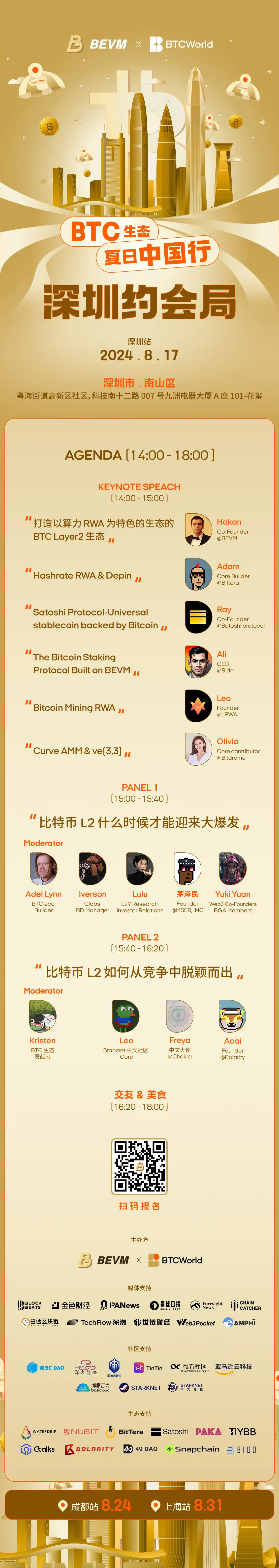由 BEVM 和 BTC World 主办的#BTC 生态中国行即将来到深圳!让我们一起探讨比特币 L2 的未来发展趋势,并在轻松愉快的氛围中享受美食美酒,畅聊区块链未来!扫码报名即可参与!
