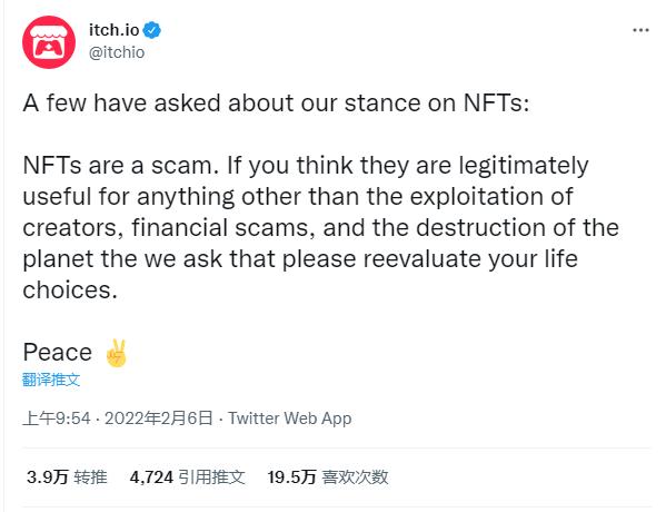 就是这么一个如此有特点的独立游戏平台,终于也忍不住正式表达出自己对NFT游戏的态度。Itch.io在推上表示,NFT就是一个骗局。