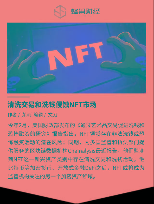 今年2月,美国财政部发布的《通过艺术品交易促进洗钱和恐怖融资的研究》报告指出,NFT领域存在非法洗钱或恐怖融资活动的潜在风险;同期,为多国监管和执法部门提供服务的区块链数据机构 Chainalysis 最近报告,他们监测到NFT这一新兴资产类别中存在清洗交易和洗钱活动。