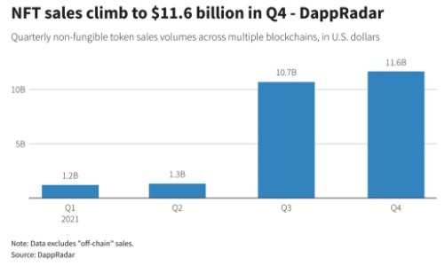 据DappRadar数据显示,2021年NFT(非同质化代币)销售额达到约250亿美元,2020年只有9490万美元,同比增超200倍。此外,NFT在第三季度销售额从第二季度的13亿美元增长至107亿美元,然而,第四季度出现增长放缓的迹象,销售额为116亿美元。