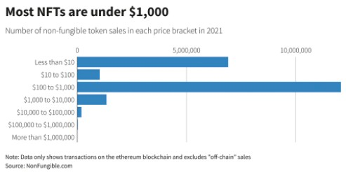 NonFungible.com认为,虽然NFT的最高售价达到6930万美元,但一般价格介于100-1000美元,并没有那么高。