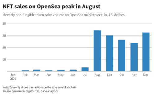 OpenSea是全球最大的NFT交易平台,它提供的数据显示,2021年NFT交易于8月达到高点,9月、10月、11月下滑,12月再次攀升。