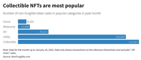 NonFungible.com称,有收藏价值的NFT是最受欢迎的类别,其次是艺术品。据了解,随着NFT市场疯狂增长,投机者涌入。艺术行业也参与进来,拍卖行高价出售NFT。3月份一件NFT艺术品通过佳士得拍卖行出售,价格高达6930万美元。就连可口可乐、Gucci也加入进来。