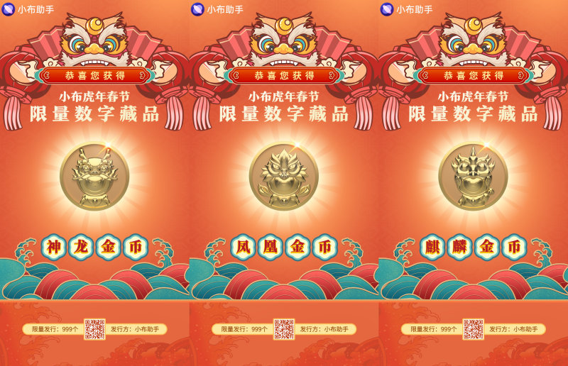 小布虎年春节神兽系列数字藏品是由小布助手限量首发,在树图链上链发行的数字藏品项目,在设计上选取金币为承载样式,以小布助手全新IP形象为核心,中国传统神话体系中的神龙、凤凰、麒麟三大祥瑞神兽形象为灵感,量身定制了三个各具特色的新装扮,配合上生动活泼的全新表情,用更加和谐、有趣且独具创意的形象将中国传统文化延申至数字世界。