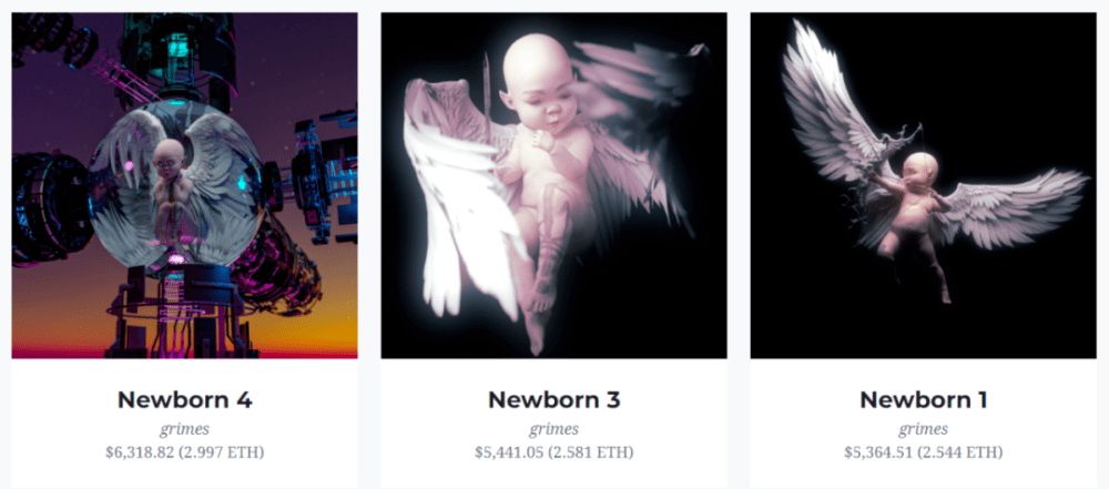 今年2月,Grimes与弟弟麦克·鲍彻(Mac Boucher)合作制作的“WarNymph Collection Vol 1”共10件作品被以NFT形式拍卖,最终成交价近600万美元,其中,两件视频短片以固定价格7500美元(5400英镑)的大型版本发售,每件作品在发售的48小时内售出约300份。