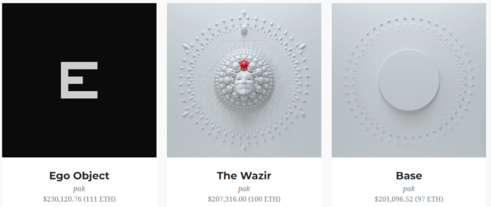 去年12月18日,Pak和前文提到的Trevor Jones 合作了三件NFT作品,投放到Nifty Gateway平台,以限时6分钟抢购的开放版本进行发售。