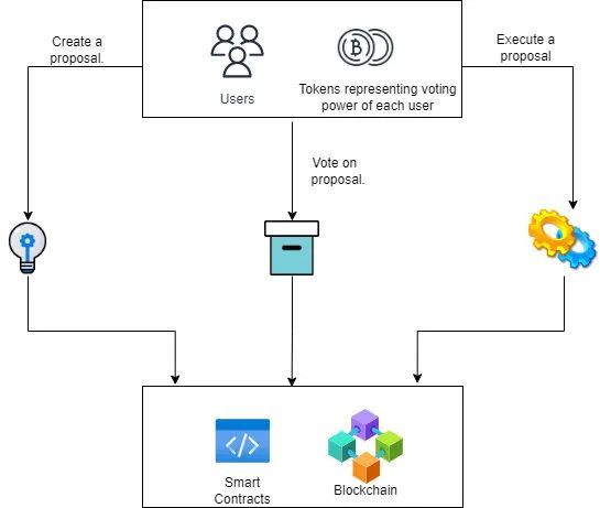 DAO向其成员发放代币,代币代表系统中的投票权。根据所设置的治理,任何人都可以创建对DAO进行更改的提案,并将其提交给规定人数(通过所需的最小百分比/投票数),并在投票时间里进行投票。成员可以对提案进行查看和投票,投票权与成员拥有的代币数量成正比。一旦投票期结束,我们检查提案是否通过,如果通过,则执行。