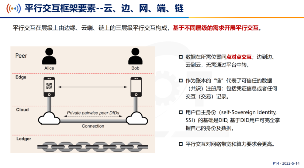 基于以上的设想,金键提出了平行交互的实现路径。他指出,平行交互框架要素主要为云、边、网、端、链,这些要素按照边缘、云端、链上的三层级平行交互构成,基于不同层级的需求开展平行交互。