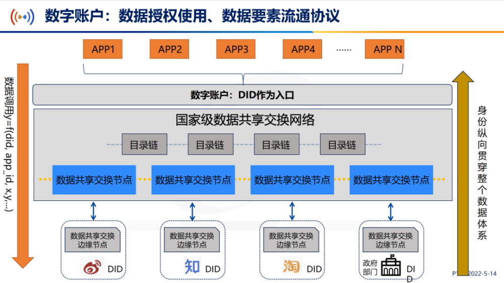 “如果数字账户体系以如上方式来使用的话,我们可以看到基于这个身份可以纵向贯穿整个数据体系,无论你在什么地方应用,你的数据可以被你严格控制。我们基于这样的体系,通过国家级数据共享交换网络开展数据授权使用和要素流通,就和现有的方式完全不一样,就可以解决掉数字空间目前面临的一系列问题。”