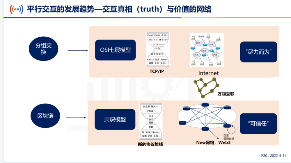 “平行交互解决的问题是人们在数字空间里的关键挑战,大家交互的是真相,交互的是“价值”。有了区块链分布式总账的理念,我们可以围绕共识模型设计一个新的协议栈,基于这样的协议栈来构建大家现在比较关注的web3,就是能实现web3的很多发展目标。从这个逻辑来看,我认为平行交互是区块链催生的整个互联网发展的新趋势。”金键表示。