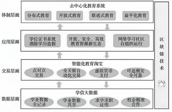 六是开发去中心化教育系统,全民参与推动教育公平。当前教育体制的中心化形式下,政府机构或学校提供教育服务并进行认证,个人对某一特定学科的精通程度,仍需由受认可的大学颁发文凭或证书来证明,导致教育的管理权被学校和政府所垄断。利用区块链技术开发去中心化教育系统,有助于打破教育权利被学校或政府机构垄断的局面,使教育走向全面开放,形成全民参与、协同建设的一体化教育系统。