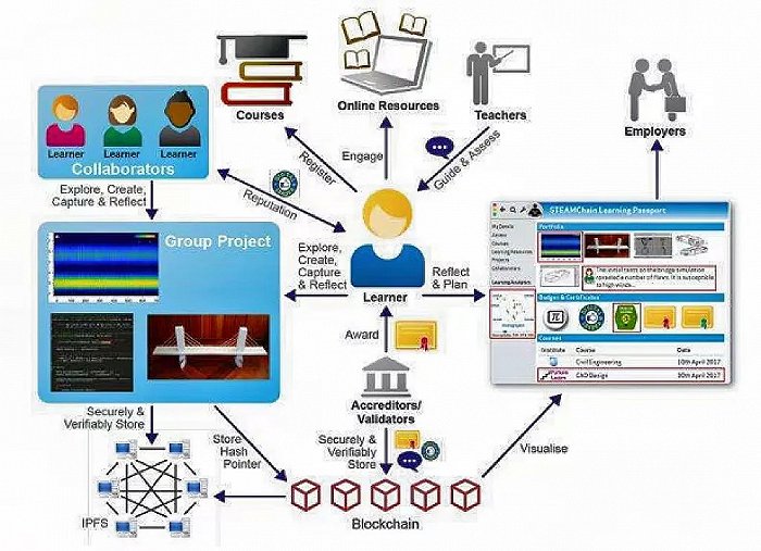 例如,我国教育体系中,如果我们用区块链打造去中心化的分布式数据结构存储系统,可以真实完整地保存学生真实学习成绩,解决学生成绩造假或成绩记录错误的问题。再比如,我们可以利用区块链公开透明及不能篡改的特点,针对学术科研成果、图书作品、课件及课程视频资源等内容,建立一个学术维权体系,来有效保证学术工作者的权益。除此之外,我们还可以利用区块链的去中心化优势,将教育资源分布式存放在不同的区块中,通过节点来进行资源传播共享,解决教育资源分配不均的问题。