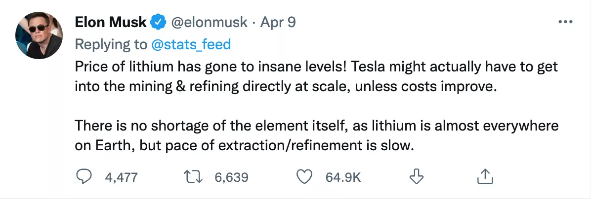 4月8日,马斯克在推特上表示:特斯拉可能会直接大规模打入锂矿开采以及提炼领域,因为作为制造电池的关键元素,锂价已经达到了“疯狂”水平。
