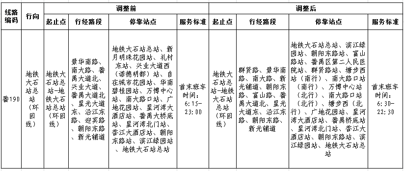 信息时报讯(记者 王思雨 通讯员 林静)为实现地铁大石总站接驳周边商业区,满足居民社区“最后一公里”的出行需求,广州市一汽巴士有限公司番禺分公司将对番190线、地铁接驳专线7路进行线路调整。