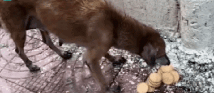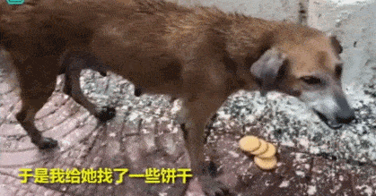 这条流浪狗就在原地吃起了饼干,看它的样子应该是很久没吃到食物了吧,身上都这么瘦了,也不知道只吃饼干不会不会感到口渴。