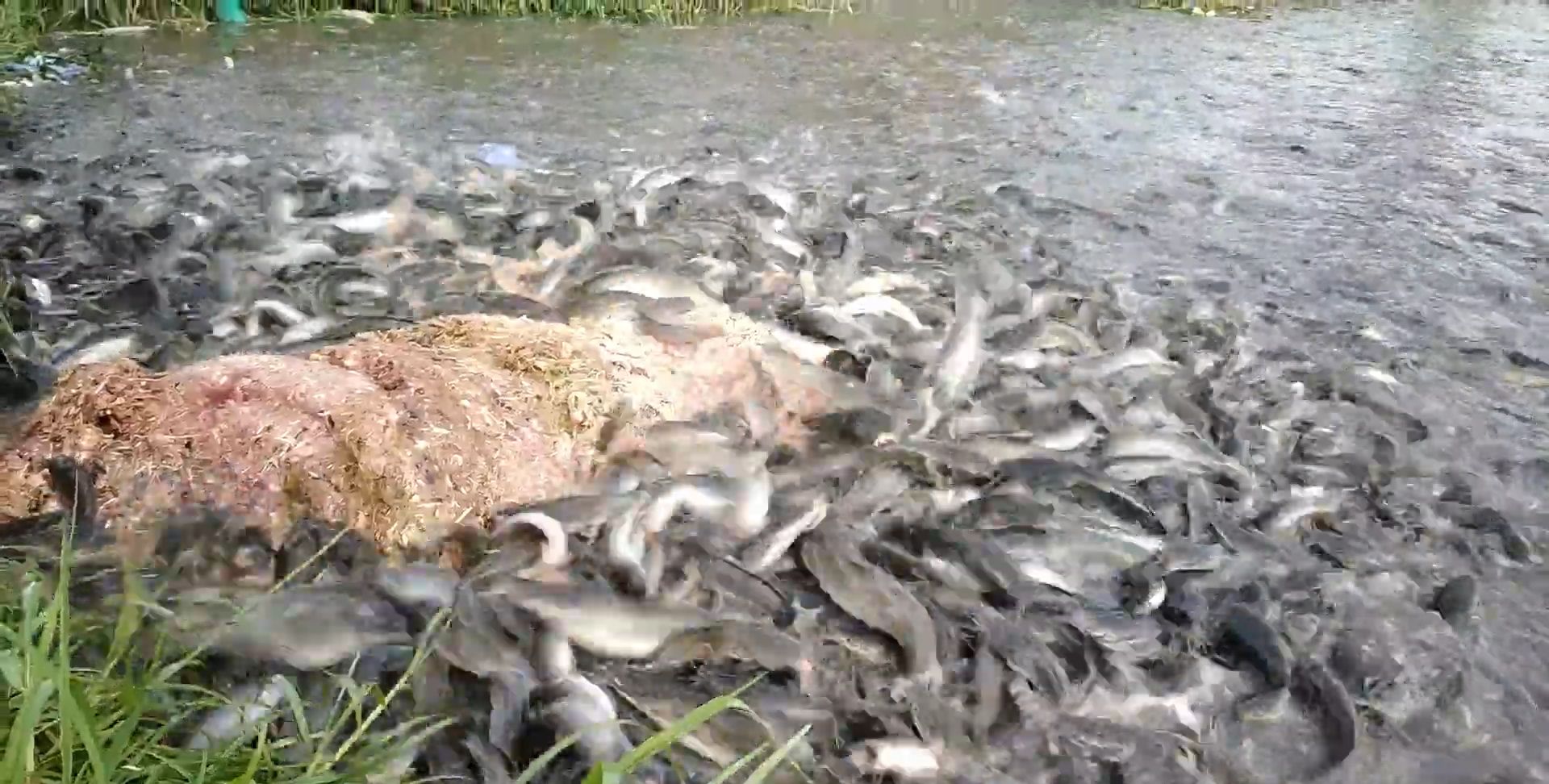 饲料配制完成,鱼儿早就迫不及待,有几条还直接蹦了上去,三哥一个跨步踏进鱼塘,饲料洒下去的瞬间,鱼儿就像跌进油锅一样,一个个拼命扑棱着,场面实在有些壮观。看这密密麻麻的一片,你们说这鱼会不会缺氧?而且这么多的鱼,就只给人家一盆饲料,是不是太抠门了。
