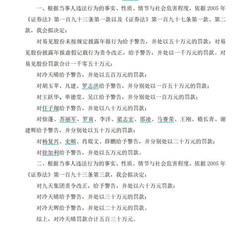 证监会拟决定,对易见股份未按规定披露年报行为给予警告,并处以50万元的罚款;对易见股份披露年报虚假记载行为责令改正,给予警告,并处以1000万元的罚款。对易见股份罚款合计1050万元;