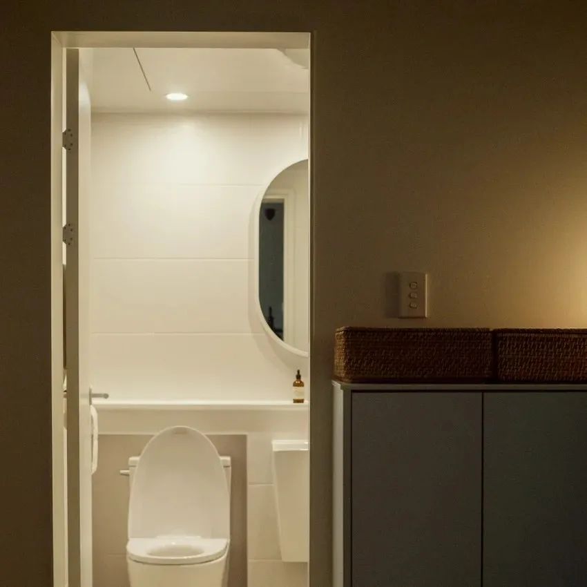 位于玄关一侧的卫生间也是不容小瞧了,除了保证基本的洗漱、如厕、淋浴3大功能区外,收纳设计也是数一数二的。