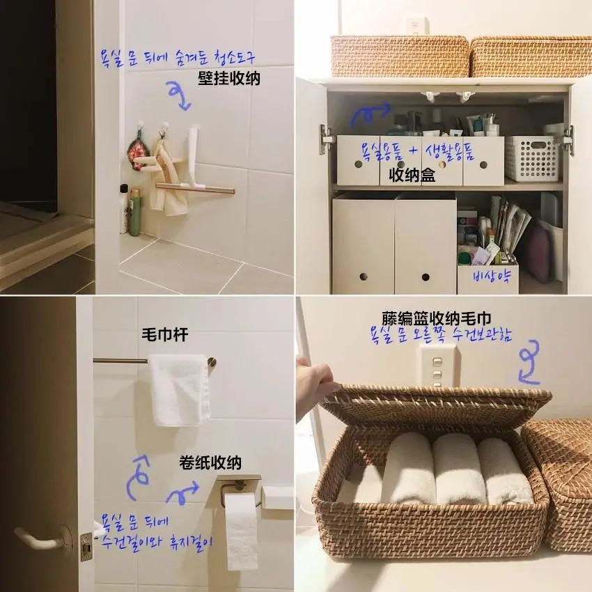 利用吸盘挂钩收纳小的清洁工具,不着地不占地避免生潮发霉;毛巾杆、纸巾挂钩能做壁挂收纳的都应用上了,就连卫生间门外放薄柜,里面也利用小收纳盒把洗漱用品按类区分归纳的整整齐齐。
