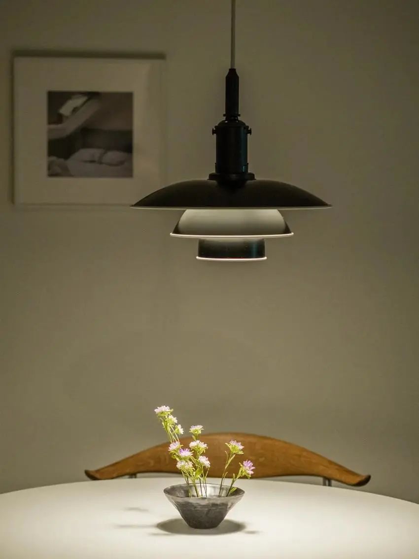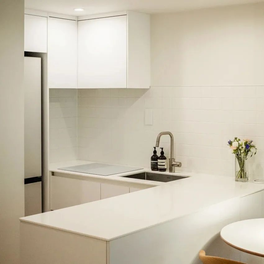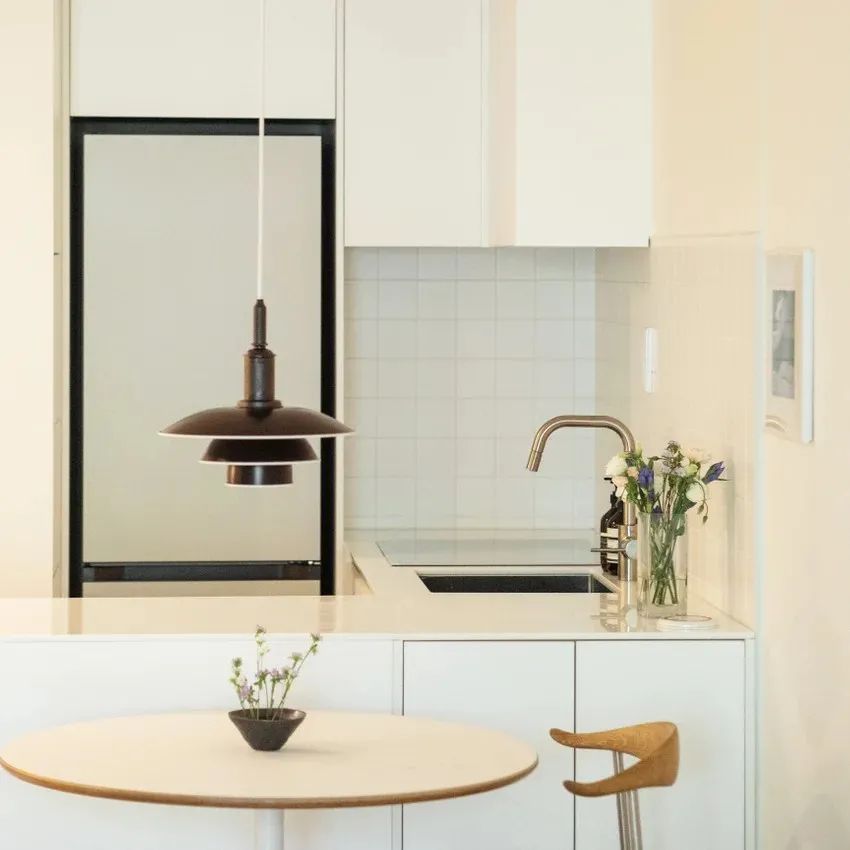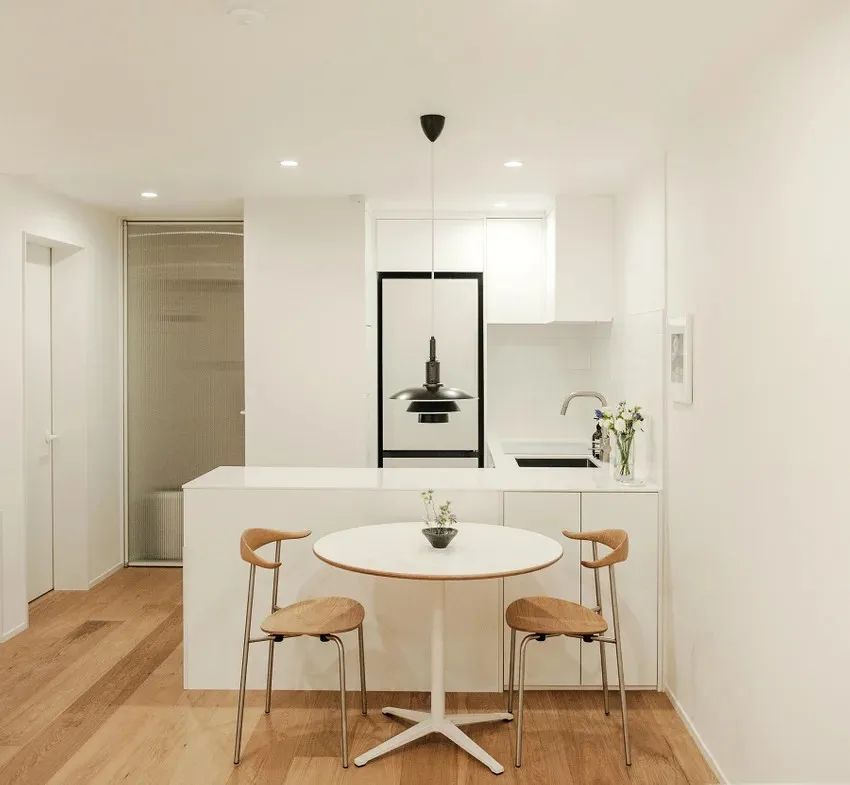 另一边的餐厨区,改动算是最大的!整体橱柜换了,也将原来的吧台桌改成了橱柜,L型的布局照样不耽误隔断功能,小夫妻俩也多出了属于俩人的专属就餐小圆桌,配上吊灯,仪式感满满。