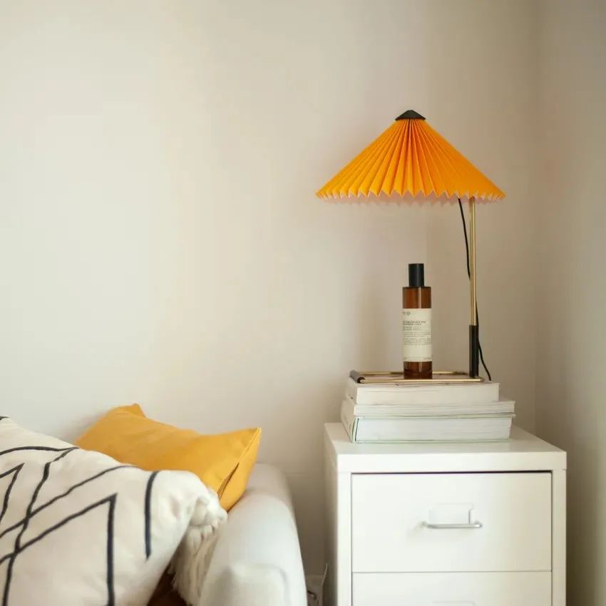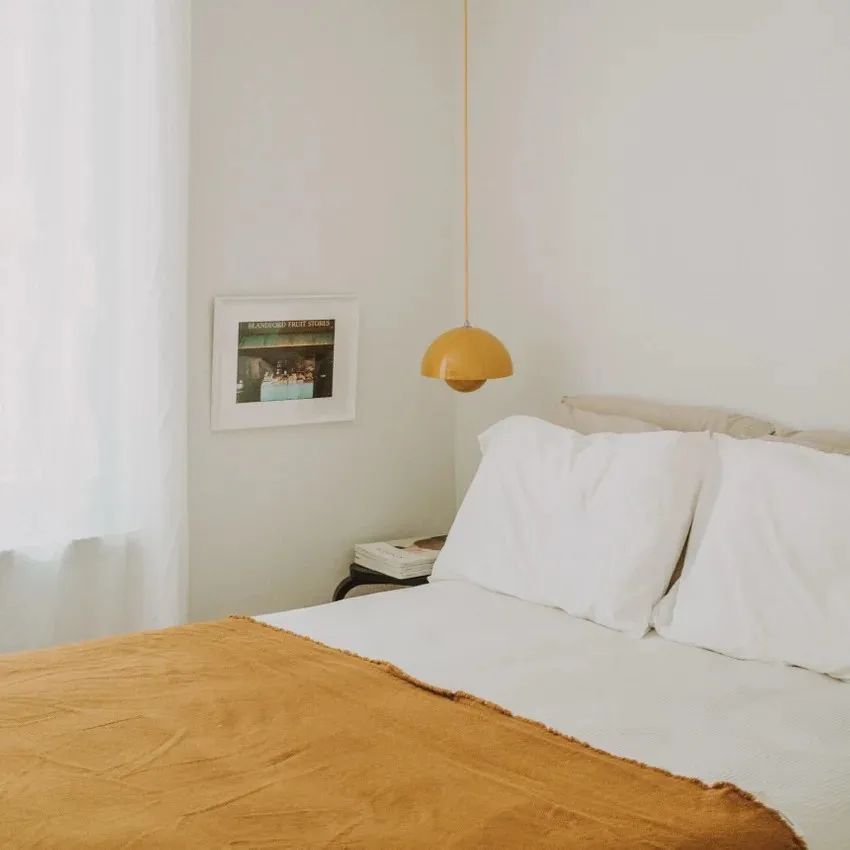 纯白为主色,暖黄色为点缀,床头吊灯又有拉伸空间的效果,夫妻俩可以在这个小空间里得到一个干净整洁又舒适的休息环境。