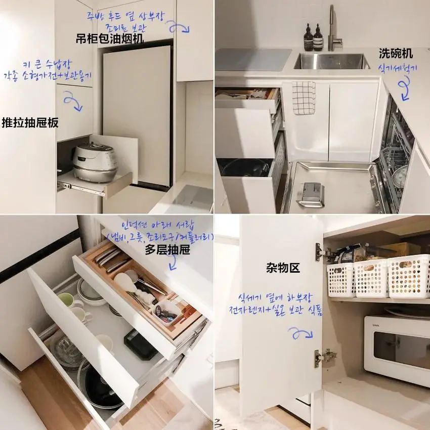 烹饪区下面安装多层抽屉柜,碗碟筷子、锅具分类收纳,安装可以减少家务工作的洗碗机,利用收纳篮整理收纳杂物......这样的橱柜内部收纳不照搬回家都可惜。