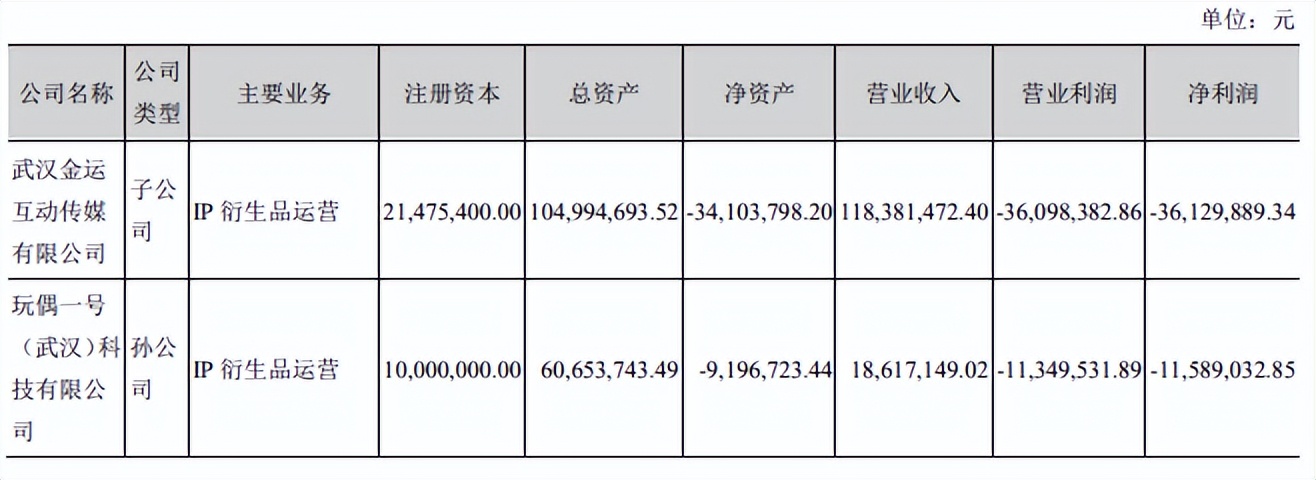 金运激光旗下运营IP小站的两家公司武汉金运互动传媒有限公司和玩偶一号(武汉)科技有限公司,都还处于亏损中,2021年分别亏损3612.99万元和1158.9万元,粗略估算IP小站亏损约4000万元。