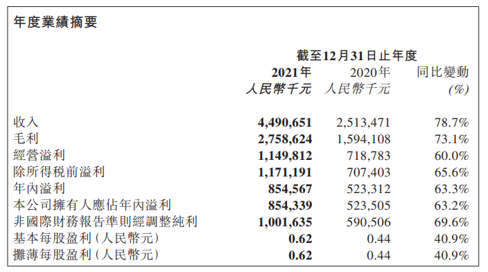 2021年,泡泡玛特收入44.9亿元,同比增长78.7%;公司拥有人应占年内溢利8.54亿元,同比增63.2%;非国际财务报告准则下的经调整纯利为10.02亿元。