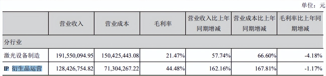 2021年,金运激光的IP衍生品运营收入达1.28亿元,同比增加162.16%;营业成本7130.43万元,同比增加167.81%。