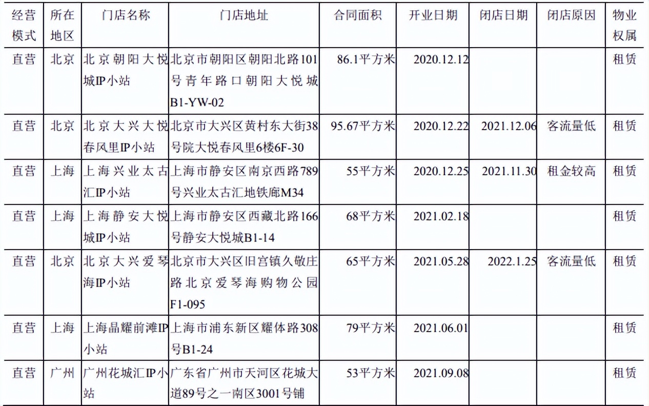线下门店方面,2021年IP小站新开4家店,关掉3家客流量低或租金较高的店,具体如下表所示。