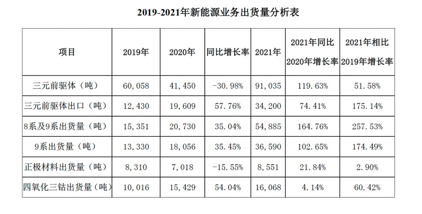 2021年,公司三元前驱体实现营收94.24亿元,同比增长205.39%,占新能源电池材料营收的68.64%,占总营收的48.83%。