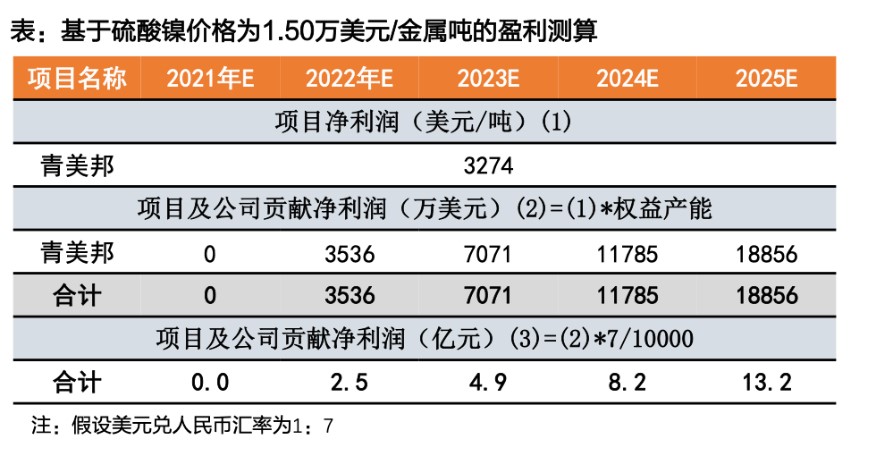 天风证券根据格林美青美邦的预计权益产能及单吨净利推算,预计2024年该项目达产后将贡献净利润1.2亿美元/年,2025年进一步扩产后将贡献净利润1.9亿美元/年。