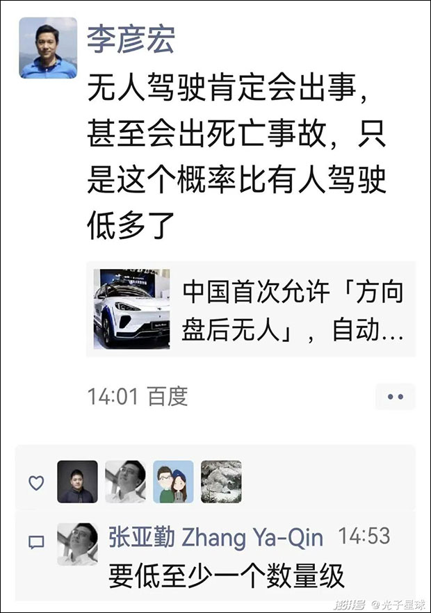 “要低至少一个数量级”,张亚勤院士跟评,无人驾驶比有人驾驶更安全,这既是统计事实,也是业内共识,但与对公众认识来说,可能还是反直觉的。