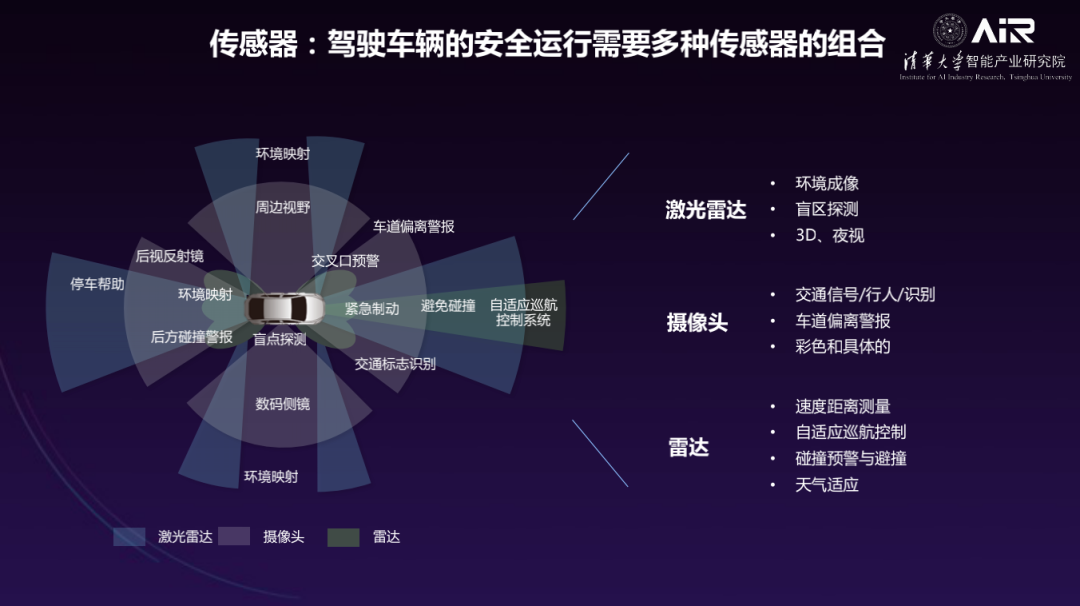 激光雷达可以直接采集距离信息,实现三维环境匹配及盲点探测;摄像头可以实现物体的快速辨认和车道识别,所采集的信息包含色彩和更多细节;雷达可以进行速度和距离的测量,发出碰撞预警并进行紧急制动。所有传感器联合起来构成对车辆所处环境全方位的立体扫描。