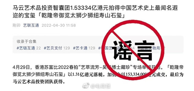 #马云基金会辟谣参与拍卖乾隆宝玺# 马云基金会回应称,马云竞拍“乾隆帝寿山石玺”和天价聘请顾问都是虚假消息,最近马云专注学习、研究农业科技。#马云基金会辟谣竞拍乾隆宝玺#