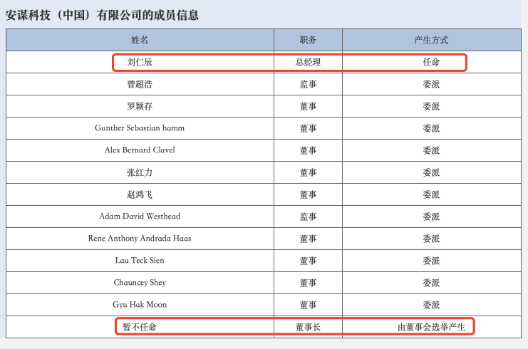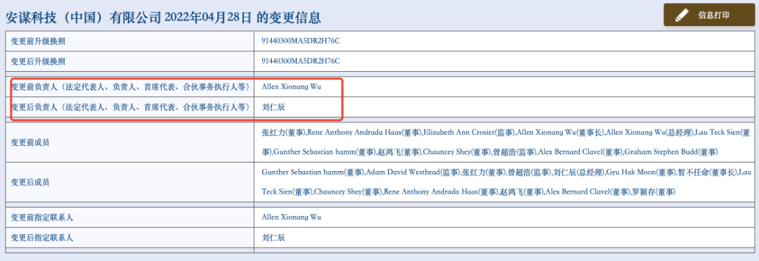 4月28日,根据深圳市市场监督管理局的工商信息显示,安谋科技的法定代表人从吴雄昂变更为刘仁辰。刘仁辰任公司总经理,董事长由吴雄昂变为暂不任命。一则简单的人事变动背后是安谋科技与股东Arm的又一次博弈。刘仁辰一方代表的是股东Arm集团与其母公司软银集团,另一方则是吴雄昂代表的现任管理团队。