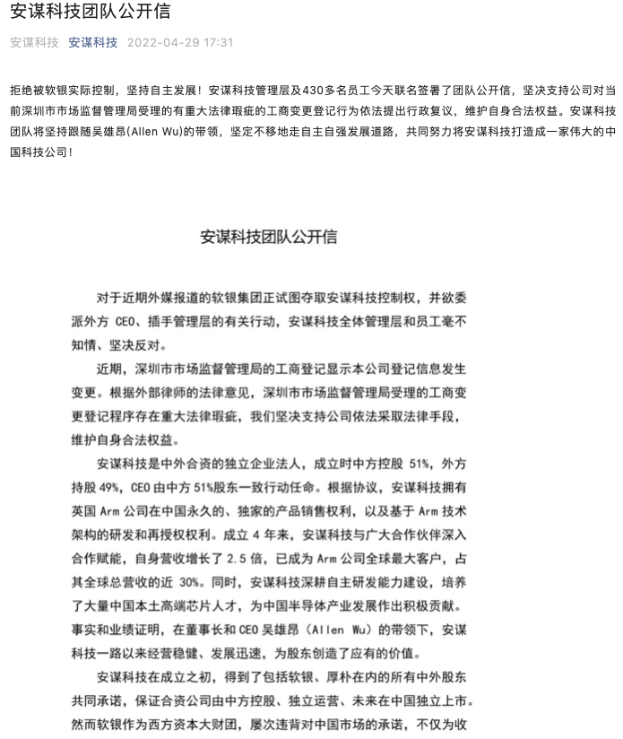 针对此次工商变更,安谋科技在公众号及官网发布一封公开信表示,支持对此次有重大法律瑕疵的工商变更登记行为依法提出行政复议,维护自身合法权益。吴雄昂同样表示,对此次变更完全不知情。
