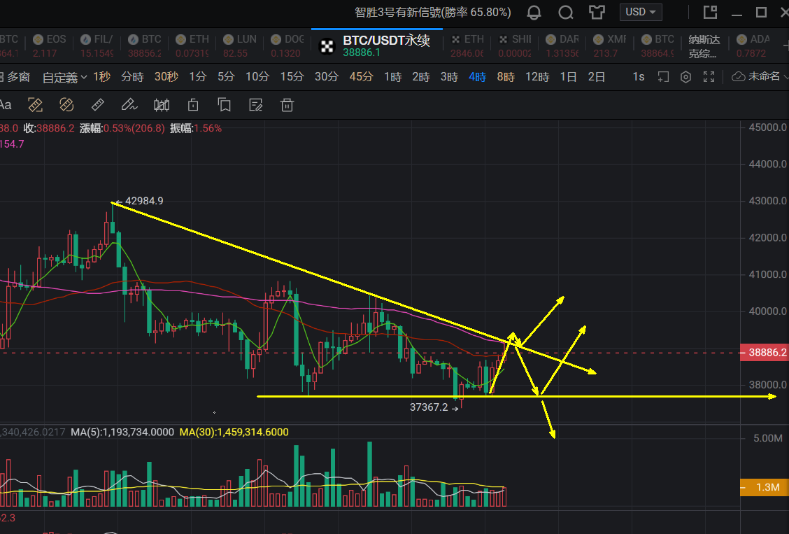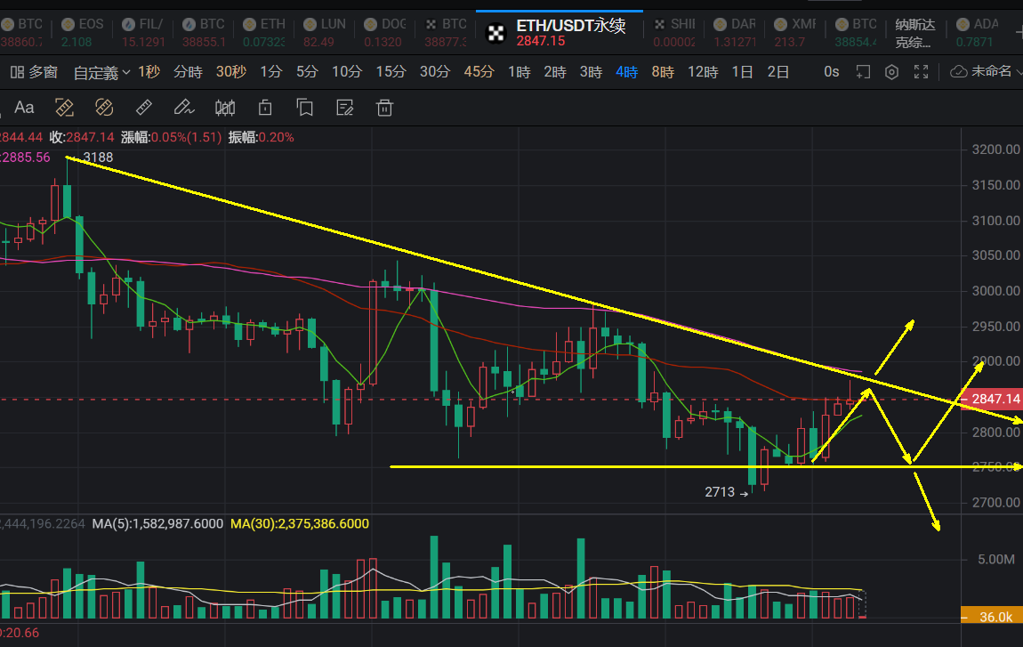 周末市场上面经过了一轮探底回升,大饼以太双双下破下方低点支撑之后走出了一个小级别的上涨行情,比特币最低跌至37300附近,以太坊也是下挫力度有限最低跌至了2710附近,短期内刺破低位之后走出了阶段性的反弹上涨,截至到目前为止反弹还在尝试向上突破4小时级别的下行趋势线压制,接下来行情的运行轨迹依然不算特别的明朗,下跌的力度和空间都没能做出改变,依然还存在低位盘整的迹象,日线继续多空轮转的过程当中依然有可能是底部试探的行情。