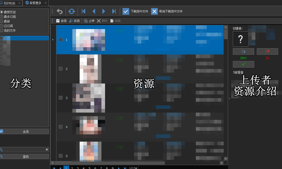 界面分为三大部分,最左侧是【分类】、中间是【资源】,右侧则是【上传者与资源介绍】。