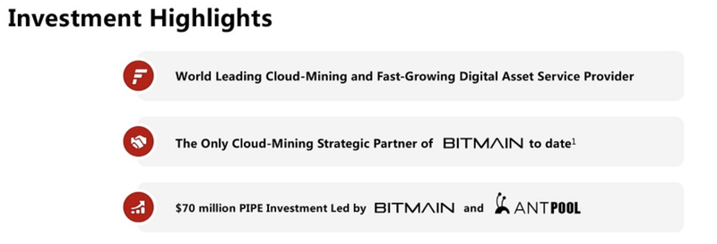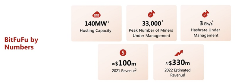 上市主体估值15亿美元,为2022年营收预期的4.6倍,合并交易拟在7月底前关闭。比特富富计划于2022年第三季度在纳斯达克上市,股票代码为FUFU。