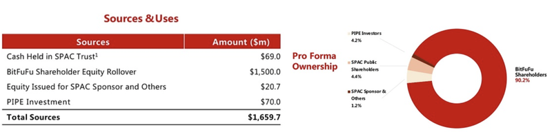 保持目前的股东持股比例不变,交易结束时,SPAC发起人、SPAC现有公众股东、PIPE投资者(比特大陆和蚂蚁矿池)以及比特富富将分别持股3.2%、4.4%、4.2%和90%。